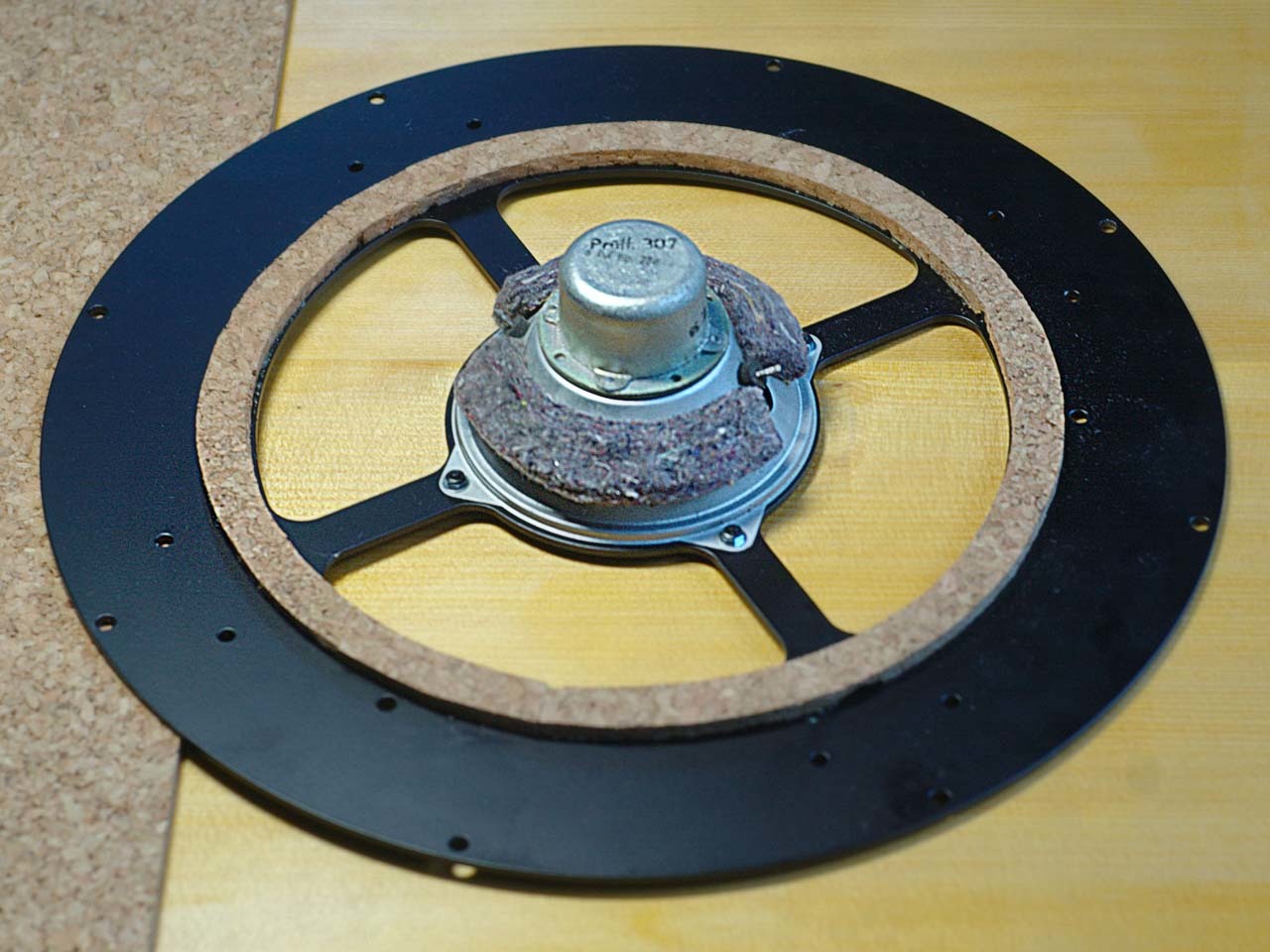 周囲のコルク製ガスケットは、ツィーターのお尻がL6のコーン紙にぶつからないようにするためのスペーサーです。このようにツィーター支持板にはある程度の厚みが必要なので、写真のような鉄板ではなく、ベニヤ板で十分です。ユニットはいろいろとあるので共通化できず、鉄板で2枚だけ作るとCAD入力などで高額になってしまうので、ベニヤ板で作れば良かったと反省しています。多少雑に作っても、板が音響レンズに隠れてしまうので気になりません。